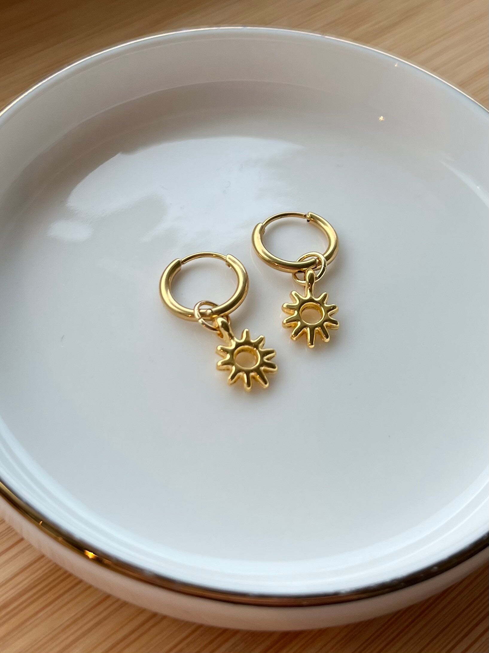 Goudkleurige Stainless Steel oorringen.De oorringen hebben een bedeltje van DQ metaal in de vorm van een zonnetje.