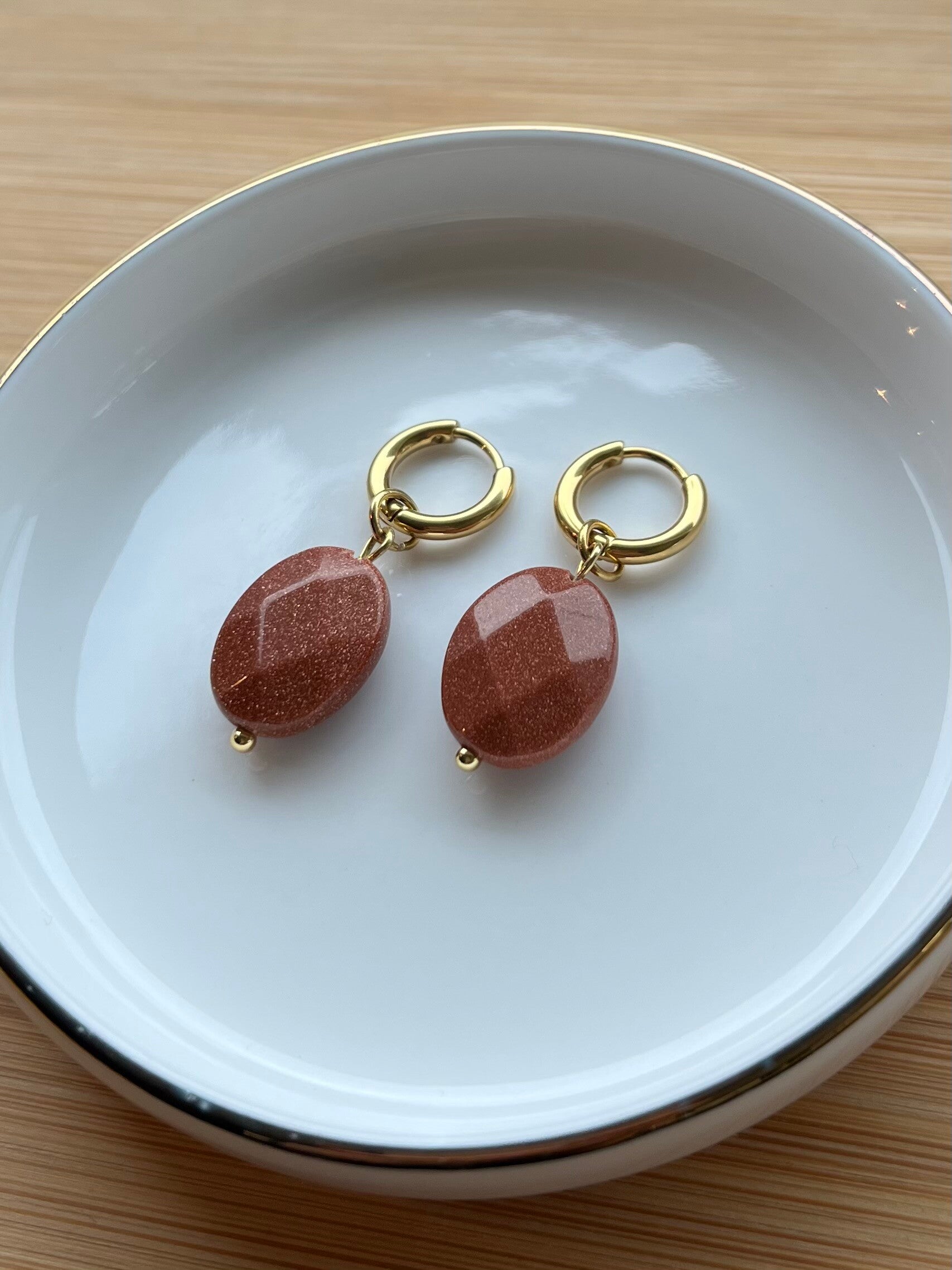 Aan de oorringen hangt een roestbruine kraal met glitter.