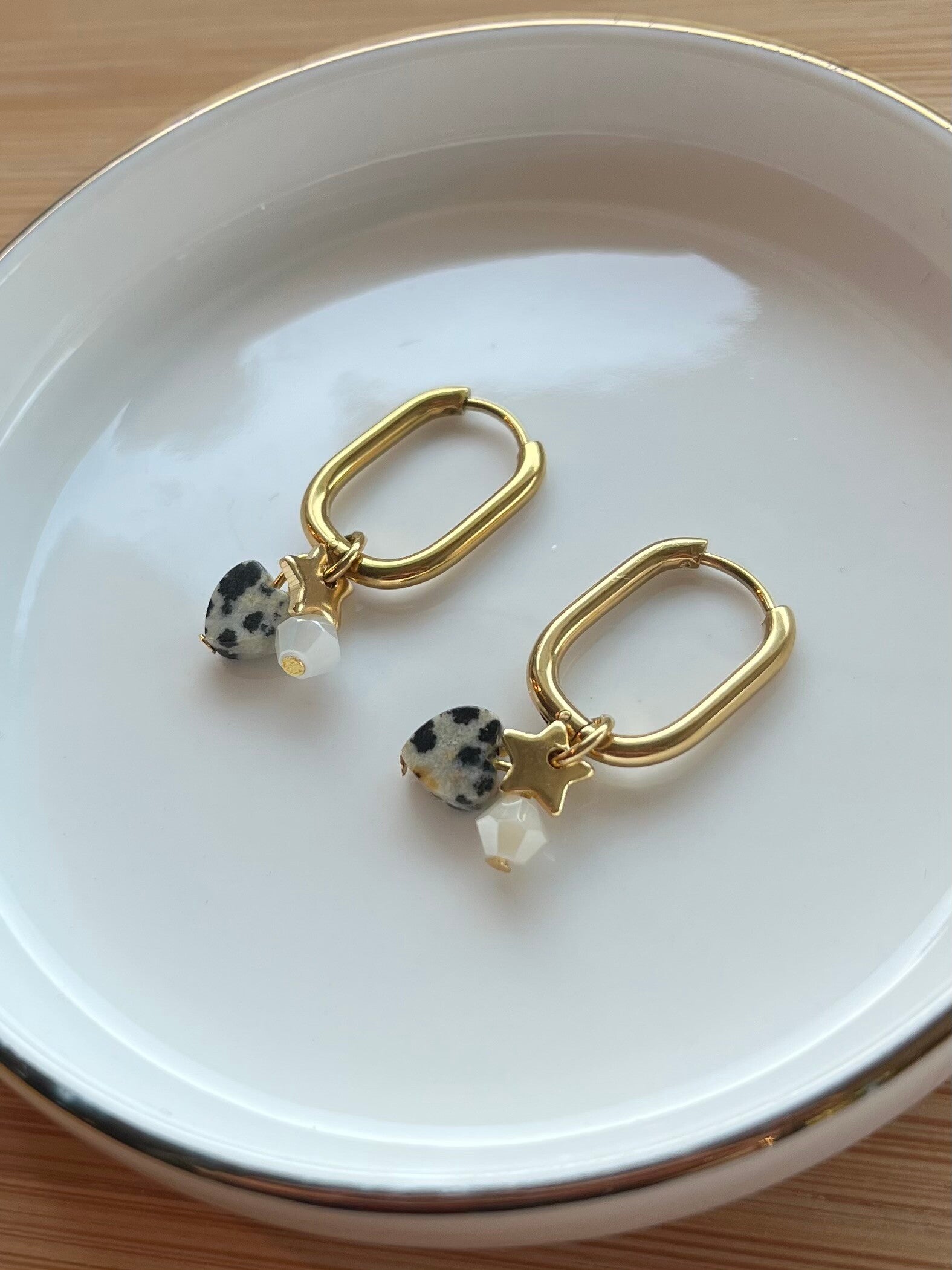 Goudkleurige Stainless Steel oorringen.De oorringen hebben een hangertje van kraaltjes en een sterretjes bedeltje van DQ metaal.